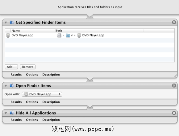 另一种方法隐藏应用程序是为了创建自动化的工作流程,当启动指定的项目时,它将自动隐藏打开的窗口和应用程序。因此,例如,您可以创建一个工作流来在启动DVD Player时隐藏所有后台应用程序。