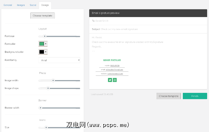 转到应用程序,然后填写要包括在签名中的个人和专业详细信息。您还可以添加指向社交资料的链接,这些链接将显示为可点击的图标。有很多样式可供选择,您可以自定义颜色,字体和其他小细节。