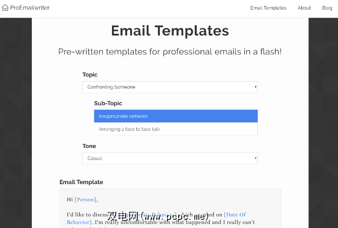 该网站是用于常见工作场所事件的模板集合。即使是像面对某人遇到问题那样动荡不定的事情,也需要一封专业的电子邮件,尤其是一封电子邮件。使用Pro Email Writer的模板,您可以自定义消息,以准确地说出您想要的内容。