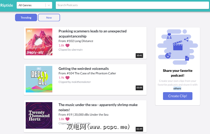 剪辑的提要完全来自用户,并且可以按流派进行过滤。您会找到播客的名称,剧集的名称以及剪辑的长度。如果您喜欢听的内容,则可以收听整集或将其添加到播放列表中(只要您已登录即可)。这是发现新播客以及共享收藏夹的一种非常酷的方法。