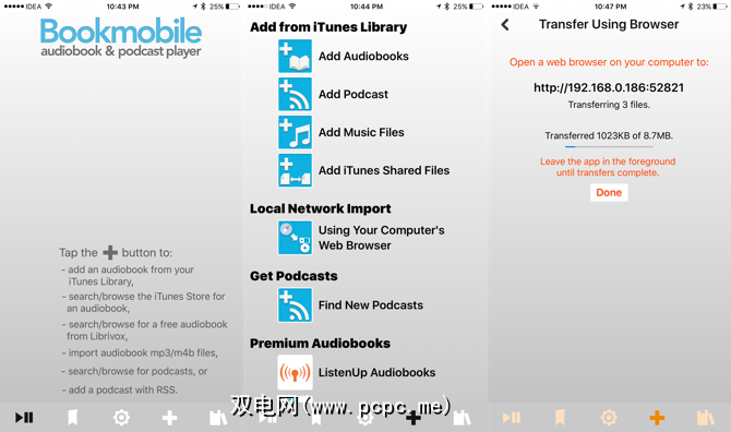 Bookmobile有多种导入有声读物的方法。它支持传统的iTunes文件共享方法。但这是一个漫长的过程。您必须将文件添加到应用程序,同步设备,然后从应用程序内导入所选文件。