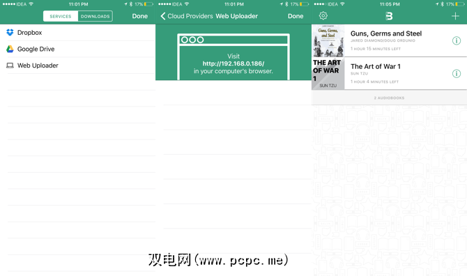 或者,您可以使用Bookmobile的Wi-Fi传输功能。两种设备都位于同一网络上之后,打开PC上的Web浏览器,然后输入Bookmobile为您提供的链接。在此处添加有声读物文件,然后将它们无线复制到应用程序中。