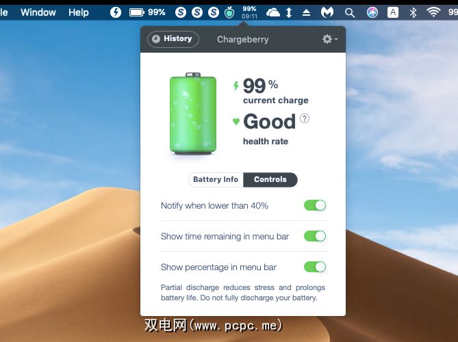 就新颖性而言,Chargeberry提供了实时能耗图表。这样可以将Mac的电池使用情况分为不同的类别,例如 Internet浏览,音乐,电影和待机。该工具可让您切换剩余时间之类的功能,还可以按自定义百分比设置放电通知。