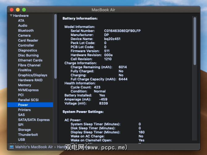 >电池信息标题显示循环次数,状态,剩余电量和电池电压。理想情况下,MacBook Air电池应可持续充电一千次。但是,较早的型号的最大循环次数较少。请查看Apple支持的电池循环页面,以获取有关所有MacBook型号的详细信息。