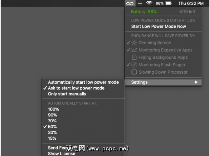 Endurance是一种更为活跃的电池管理工具,旨在帮助Mac用户延长电池寿命。电池电量低于某个百分比时,它将Mac切换到低功率模式。该工具通过调暗屏幕,监控昂贵的应用,监控Flash插件,降低处理器速度和隐藏后台应用程序。
