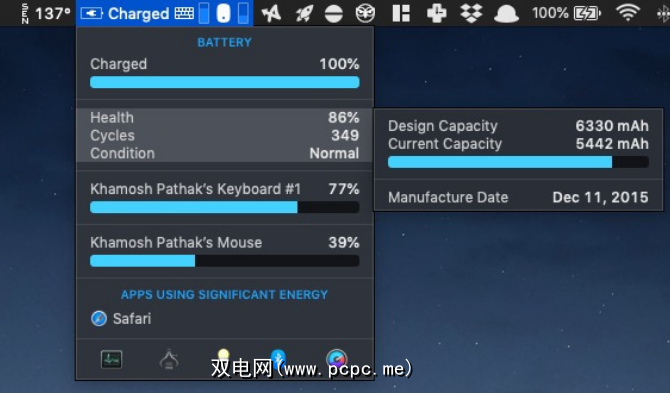 如果要添加 Fan Speed ,内存消耗和网络指示器。除此之外,iStat菜单还提供了有见地的电池监控工具,可帮助您及时了解电池电量。该工具显示电池运行状况,循环和状况。
