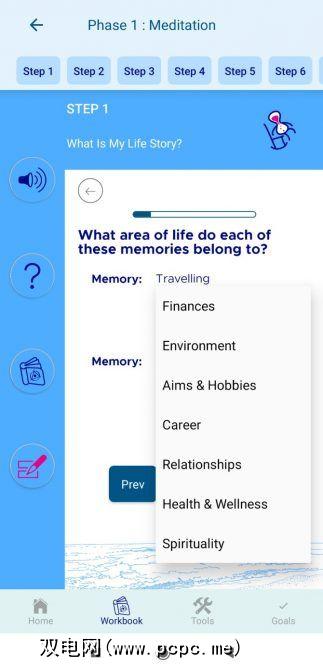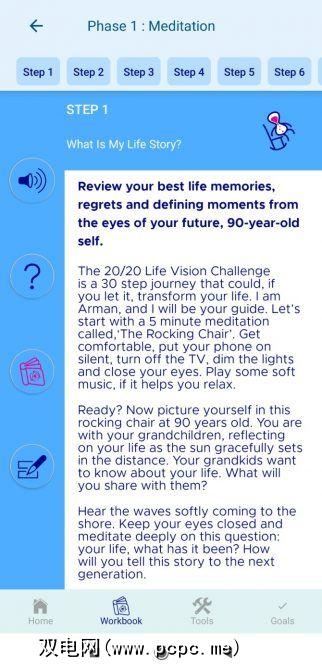 这些阶段包括发现,自我评估和创造视觉。该应用程序将指导您完成“摇椅"冥想,您可以想象自己已经90岁了,回头看看自己的生活。基于冥想的可视化,该应用程序将向您询问一系列问题以设置您的目标和计划。