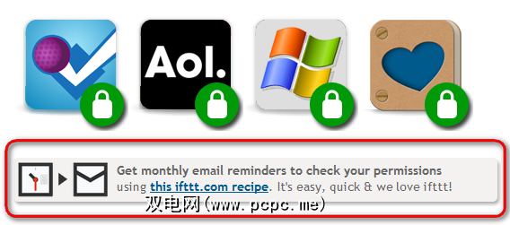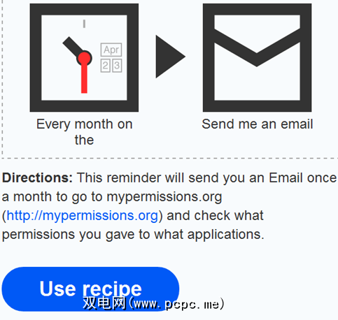 向下滚动并在图标下方查看指向ifttt配方的链接。您也可以在这里访问它。如果激活此食谱,您将每月收到一封电子邮件提醒,以访问MyPermissions并检查是否有任何值得删除的权限。