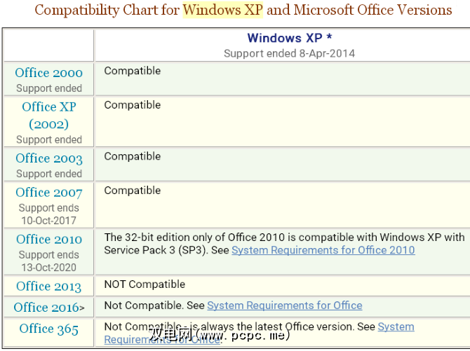 如果您要坚持使用Microsoft Office ,则不能在Windows XP上使用任何现代版本。 Office 2013和2016(并通过扩展来始终更新的Office 365)仅适用于Windows 7和更高版本。