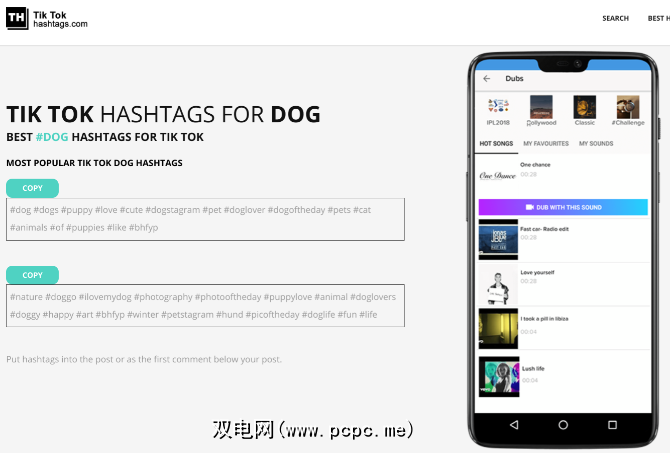 因此,在TikTok的Hashtags中键入单词“ dog"可以立即生成15-20个标签的盒子。点击“复制"并将其粘贴到新的TikTok视频中,或将其粘贴为您的第一条评论。