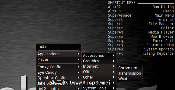启动ArchBang,您赢了没什么。有一个黑色的墙纸,一个快捷键列表和一个非常简单的底座: