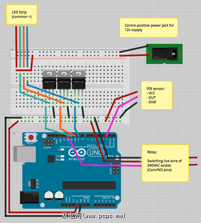 我还将在该项目中集成一个小夜灯,该小灯可以检测运动并在床下激活离散的低水平照明灯(3分钟超时),与LED照明灯分开那会导致我和我妻子都醒来。床下照明系统将是商用市电,因此我将在插座内插入一个继电器以将其打开和关闭。如果您在任何情况下都不愿意使用110-240v AC主电源(通常是一个好规则),请按照Raspberry Pi Arduino家庭自动化项目中的说明,用开关插座连接433 MHz无线发射器。