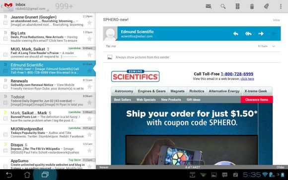 我还应该指出,在此停靠的设备上以横向模式运行的应用程序平板电脑有足够的空间来操作和阅读。我使用Gmail进行了测试,因为我对电子邮件非常挑剔-我希望有空间可以快速滚动浏览新邮件并预览电子邮件本身,然后再决定删除或回复。完全没有问题。