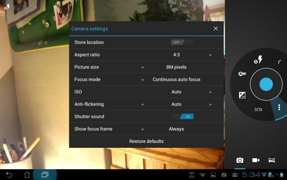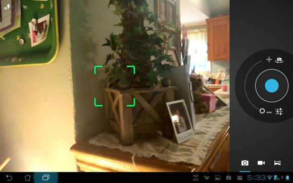 通过点击快速更改相机设置设置图标。您可以打开或关闭闪光灯,调整图像尺寸,快门声音,防闪烁等。我以为我的摩托罗拉Droid可以拍出漂亮的照片,但是对于平板电脑来说,这台相机确实给人留下了深刻的印象。