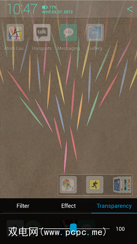 在这里您可以看到我正在调整所有主屏幕元素的透明度。老实说,这真是天才,这是Atom Launcher带来的最佳功能之一。我知道没有其他发射器可以做到这一点。效果的选择很差(目前只有四个),效果看起来也不是很好,但是核心概念非常强大,我希望Atom Launcher团队能够找到资源(和设计者)来提供效果。