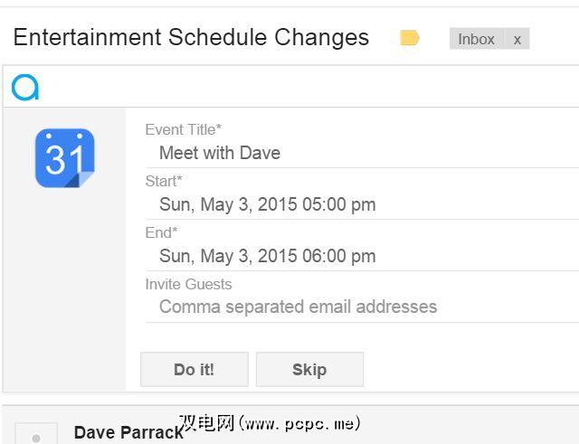 如果点击日历"图标,然后从Gmail收件箱的右侧,可以将一个事件扔在一起。也许是与那个人的一次快速会议。您甚至可以在“邀请客人"字段中包括其电子邮件地址,这将触发自动电子邮件请求。