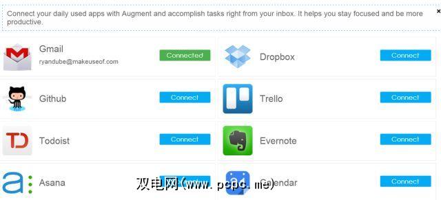 首次单击此按钮时,您会看到一个您可以使用Augment集成到Gmail收件箱中的所有云服务的列表。就我而言,除了其中一个帐户外,我都拥有其他帐户-这意味着Augment对我非常有用。如果您通常使用Trello,Todoist,Dropbox或此处列出的其他任何服务,您将发现同样的好处。