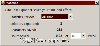 如果您点击顶部的 Statistics 按钮, ,您可以准确查看已保存的击键次数,并将其转换为以WPM为基础保存的时间。