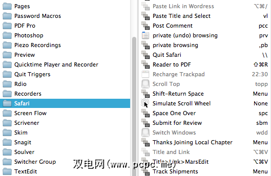 KM的“记录快速宏"可以记录您在Mac上执行的一组操作,您可以将结果用作宏。另外,您可以分配和分组宏以仅在指定的应用程序中执行。我的宏仅在Safari处于最前沿时才起作用。例如: