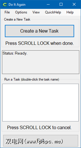 启动应用程序后,您可以在其中创建不同的“任务"每个任务都是一系列击键,鼠标操作或两者的序列。要开始记录新任务,请点击创建新任务。完成后,按滚动锁定,然后为其命名。完成任务后,您可以将其设置为重复以及执行频率。