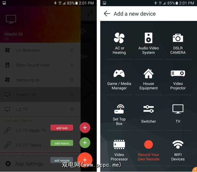 使用AnyMote应用,您可以在多个遥控器之间切换。您要做的第一件事是为您拥有的所有电子设备添加兼容的遥控器。您可以通过在侧边菜单中滑动,点击 + 符号,然后单击添加远程来实现此目的。