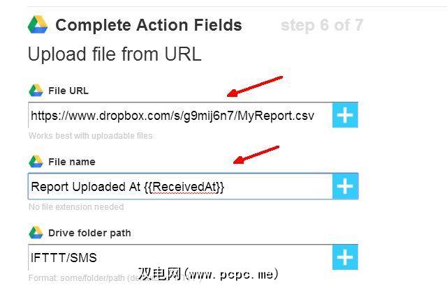 如您所见,您只需将文件URL设置为Dropbox中的文件URL。使用SMS的“ ReceivedAt"日期命名文件,以便每次上传文件时都会收到一个新日期,然后选择您要生成报告的Google云端硬盘路径。