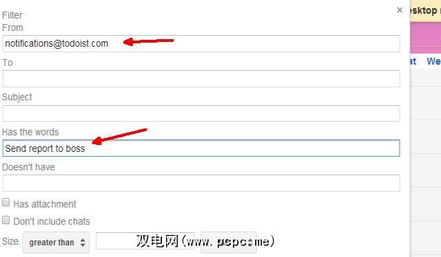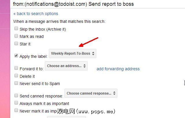 现在,进入您的电子邮件帐户,并为该正文设置过滤器。对于过滤器,让您的电子邮件客户端将标签应用于电子邮件。在这种情况下,我们将使用“每周向老板报告"标签。对于过滤器,它来自“ [email protected]",然后您任务名称中的所有单词都将进入“有单词"字段。