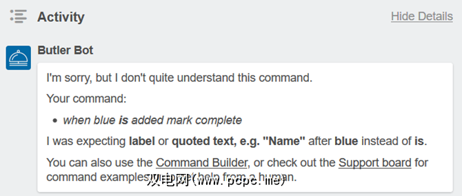如果命令有问题,您将看到感叹号标签。然后,打开卡片,然后在“活动列表"中查看Butler Bot发现有什么问题。