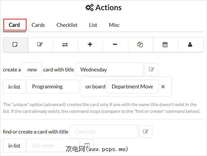 “卡"部分包括八个子类别供您选择,包括添加到,从中删除,查找,创建,复制,设置截止日期和订阅。这使您可以设置操作,例如添加和删除贴纸,复制标签或链接两张卡作为附件。或者,您可以更详细地在特定板上的特定列表中创建具有特定标题的新卡。