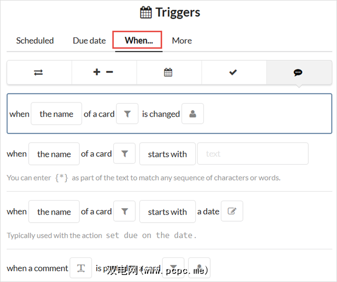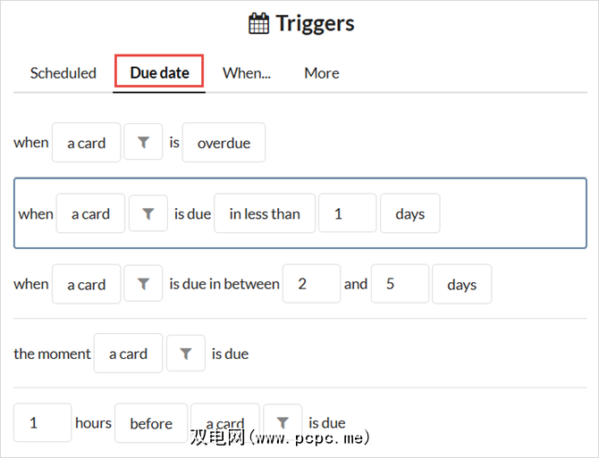 “到期日"触发器集基于实际您的卡的到期日和选择的范围很广。这些包括打开或存档卡的时间,过期或即将到期的时间。除了可以灵活选择卡片到期日附近的触发器之外,您还可以根据需要具体确定应使用哪些卡片。