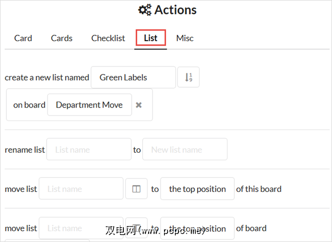 在“列表"区域中,您可以创建,重命名,移动,存档,或在板上排列列表。您还可以使用将列表放置在板上特定位置的操作。这样一来,您就可以根据触发器在所选板上创建一个具有特定名称的新列表。