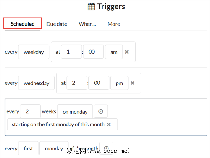 如果您要按常规时间表触发操作,则需要使用Scheduled选项。您可以安排每天,每个工作日或特定日期的操作。您还可以每周,每月或每年安排一次操作。使用每个选项,您可以根据需要设置特定时间。而且,灵活的每周和每月选项使您可以选择何时开始。例如,您可以在一天之内,在本月初甚至是下个月的第四个星期四开始触发。