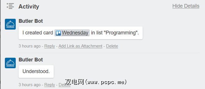 为Butler输入命令时,默认情况下,如果Butler理解该命令,您将看到一个复选框标签。您也可以打开卡片,并在“活动"列表中以“了解"的形式看到Butler Bot的响应。
