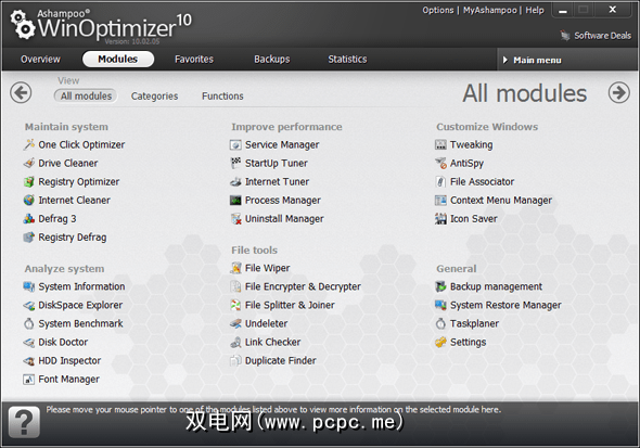如果深入研究WinOptimizer 10,您会发现包含许多精彩工具的宝库,这些工具分为所谓的模块。每个模块分为六个类别之一,每个类别具有六种不同的工具: