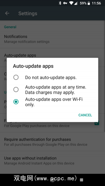 打开Play商店并滑出左侧菜单。选择设置,然后点击自动更新应用。选择仅通过Wi-Fi自动更新应用,以避免使用移动数据进行更新。