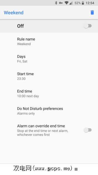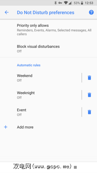 下面,您会找到自动规则。您的电话包含一些入门模板,因此您可以修改这些模板或创建自己的模板。他们让您选择该模式应该运行的日期,时间以及通知的发送方式。如果您创建事件时间表,甚至可以为日历中的事件设置“请勿打扰"。