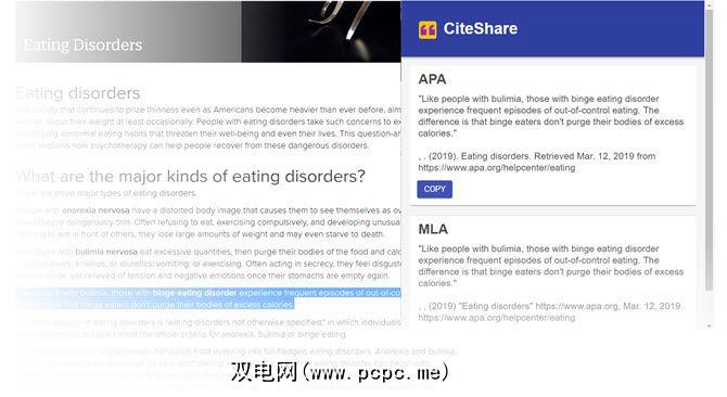 Citeshare是可在任何地方找到的最快的Web文章引用工具之一。 Chrome扩展程序仅支持APA或MLA。但是,您只需要在浏览器中加载在线文章,然后单击扩展即可将其引用。