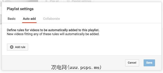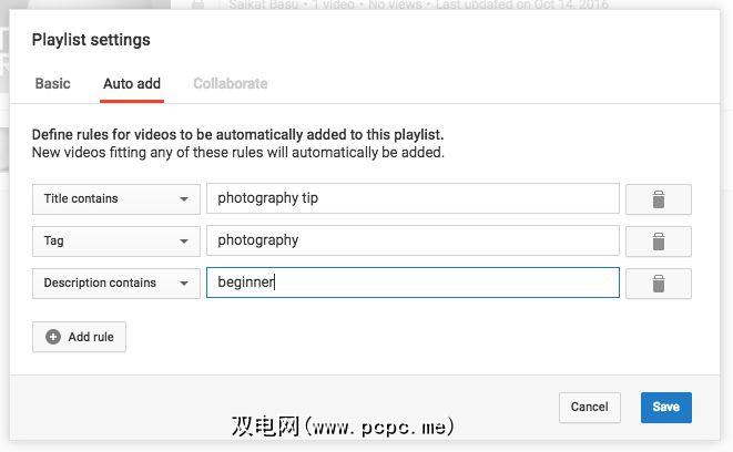 您为视频定义的规则可以基于标签,标题中的关键字或描述中的关键字。您可以使用规则组合来确定正确的视频。只需点击添加规则按钮。 YouTube将添加任何符合规则的新视频。视频会自动添加到播放列表中。