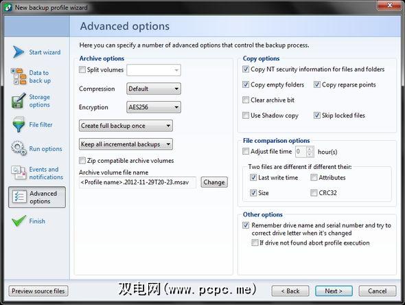 如“高级选项"窗口中的说明所述,您可以在此处指定许多选项,控制备份过程,例如拆分卷,加密,压缩,更改存档卷文件名以及几个复制选项,文件比较选项及其他。