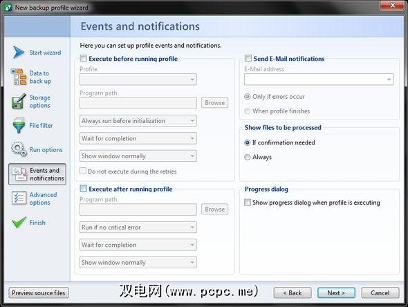 事件和通知选项非常方便。您可以在运行配置文件之前和/或之后执行程序。您还可以根据是否发生错误甚至在每个配置文件结束后选择接收通知。