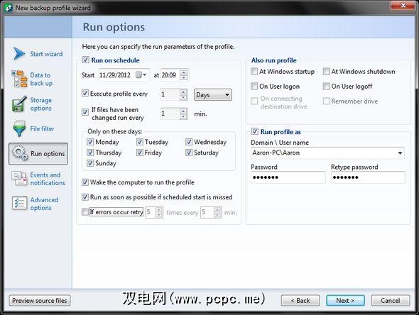 此外,选中此选项可以唤醒计算机以运行该文件。配置文件,如果错过了预定的开始时间,还可以选择尽快运行。两者都确保无论如何都将运行备份。在Windows启动和/或用户登录时运行配置文件是可选的。根据您计算机的速度,您可能不想再减慢其启动时间。另外,请确保输入计算机的登录凭据,然后选中“ 运行配置文件为"旁边的框。