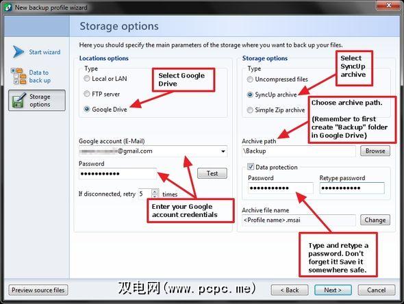 图片,首先您必须在位置选项中选择“ Google云端硬盘"。然后输入您的Google帐户凭据(请务必对其进行测试)。确保标记了存储选项下的 SyncUp存档,然后选择存档路径(Google云端硬盘文件夹)。最后,您需要创建一个密码。建议您将其保存在安全的地方,以免忘记它。