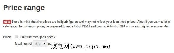 价格范围仅允许您设置每日饮食预算。越高,每餐的质量越高。如果您宣布预算紧张而对大量卡路里感兴趣,那么“ 准备吃很多PB&J和豆类。"