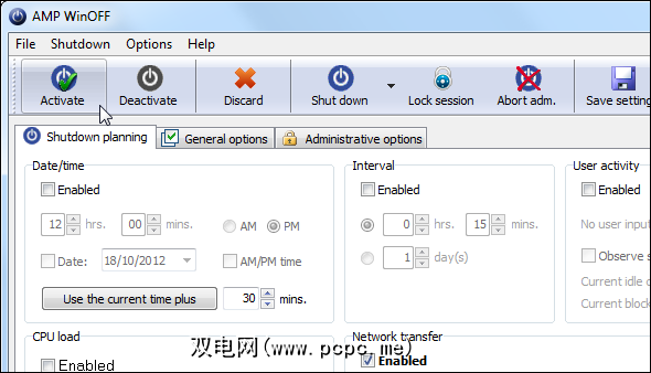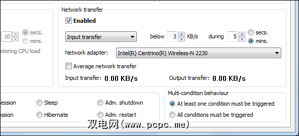 AMP WinOFF是您可以使用的另一个应用程序在某些情况下自动关闭计算机电源。它比SmartPower灵活得多,可以根据网络活动安排停机时间。您可以让它仅关注输入(下载活动),而不关注输出(上传活动)。在AMP WinOFF中启用 Network transfer 触发器,选择Input transfer,输入速度,然后选择您的网络适配器。