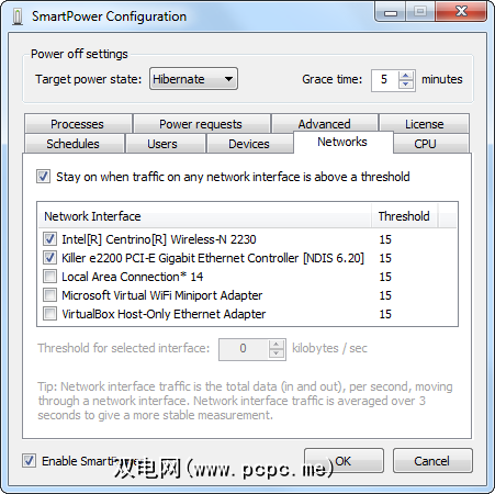 Next, click over to the Networks tab and enable the Stay on checkbox. Select your network interfaces and specify a traffic threshold. At the scheduled time – midnight, for example – SmartPower will try to automatically shut down your computer. If there’s network traffic, SmartPower will wait until the network traffic drops below your configured threshold (in other words, it will wait until the download is finished) and shut down your computer.