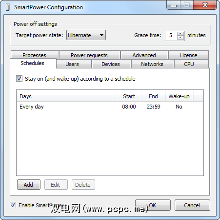 要让SmartPower自动为您的计算机供电下载过程完成后,如果计算机关闭,请使用 Schedules 标签设置关机规则。例如,如果您通常在午夜左右上床睡觉,则可以设置一个规则,该规则将在午夜自动关闭计算机电源。 (您也可以选择在特定时间重新打开计算机,这样便可以在早晨准备就绪并等待您。)