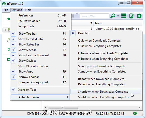 例如,如果您要使用uTorrent下载文件,则可以点击 Options 菜单,指向自动关闭,然后选择以下选项之一以在下载完成后进入休眠,挂起(待机)或关闭计算机的状态。