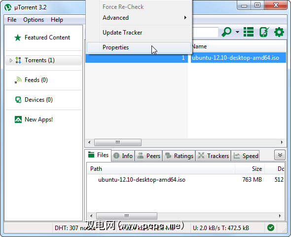 在uTorrent中,右键单击一个下载的torrent文件,然后选择 Properties 。