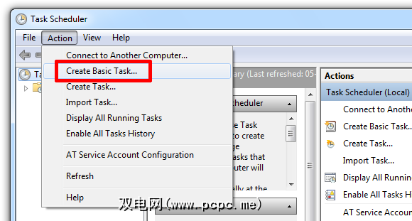 在“任务计划程序"窗口中,转到>动作,然后选择>创建基本任务…