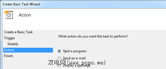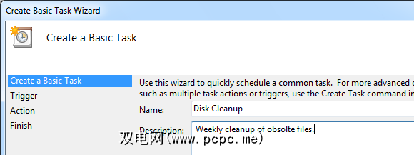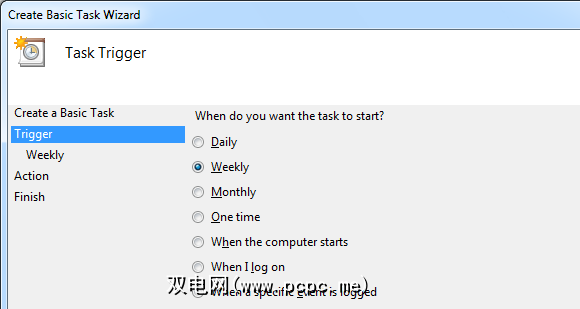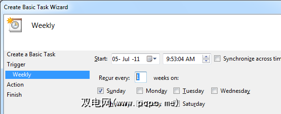 任务触发器确定何时启动任务。在这种情况下,我希望磁盘清理实用程序每周运行一次。单击>下一步设置日期和时间。